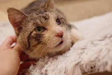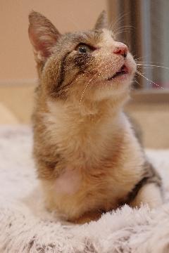 毛色 キジ白(短毛) 年齢 推定4歳 性格 「んにゃー!」と元気いっぱいの声でアピールするキジ白の男の子です。 人が大好きで、ゴロゴロスリスリして甘えてきますが、少し環境の変化が苦手で、人見知りする所があります。 ケガの後遺症により口の開け閉めがしにくく、お水を飲んだり、ご飯を食べたりするのに工夫が必要です。また、左眼が見えず、瞬きが出来ないため毎日の点眼が必要です。 獅童の性格や身体的な特徴をよく理解して、愛情をもって丁寧なケアをしながら暮らしていける飼い主さんを募集しています。 備考 完全室内飼養で、最期まで責任をもって飼って下さる方を探しています。譲渡後はかかりつけ動物病院で健康診断を行う必要があります。 3種混合ワクチン接種済。 猫免疫不全ウイルス抗体検査:陽性 猫白血病ウイルス抗原検査:陰性 費用等 譲渡の際には、マイクロチップ挿入代として2,000円(別途、指定登録機関への登録手数料)がかかります。 |